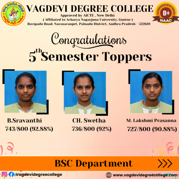 UG 2ND SEMESTER REVALUATION RESULT AUGUST-2023 | ANU UG SEM 5 SUPPLY EXAMINATION RESULTS FOR NOVEMBER-2023 | ANU UG DEGREE ONE TIME OPPORTUNITY EXAMINATION SEPTEMBER/OCTOBER RESULTS 2023 | ANU UG 2ND SEM REGULAR & SUPPLEMENTARY EXAM RESULTS JUL/AUG 2023 Notice Board UG 4th sem revaluation results 2 Sem Results Released April 2025 Principal's Message Vagdevi Degree College , Narasaropet was established in 2013 in Palandu region with aim of provide a quality education for rural areas of this region and urban students. It is one of the reputed Degree colleges in Narasaropet. Read More About College Spotlight Focus Departments Administration Academics Recognitions Vacancies Azadi Ka Amrut Mahotsav College Magazine Committees Placement Cell Sports Facilities Results Notices Committees Alumni Press Releases Photo Gallery B.C.A 4TH semester Toppers in Narasaraopet BSc 4TH semester Toppers in Narasaraopet B.Com 4TH semester Toppers in Narasaraopet campus placments campus placments campus placments B.com 5th Semester Toppers BSC 5th semester topers BSC 5th semester Toppers BSC 3rd Semester Toppers B.Com 3rd Semester Toppers BCA 3rd Semester Toppers View All Photo Gallery Video Gallery View All Video Gallery