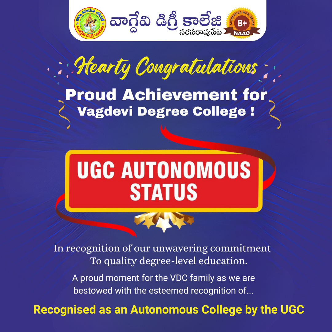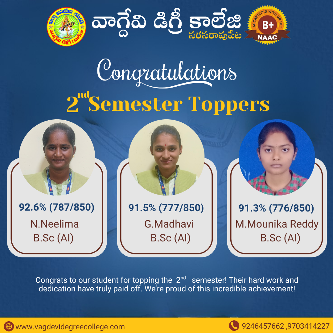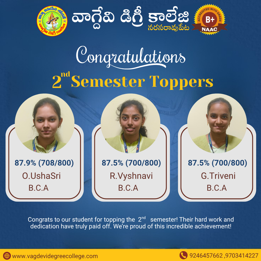 UG 2ND SEMESTER REVALUATION RESULT AUGUST-2023 | ANU UG SEM 5 SUPPLY EXAMINATION RESULTS FOR NOVEMBER-2023 | ANU UG DEGREE ONE TIME OPPORTUNITY EXAMINATION SEPTEMBER/OCTOBER RESULTS 2023 | ANU UG 2ND SEM REGULAR & SUPPLEMENTARY EXAM RESULTS JUL/AUG 2023 Notice Board UG 4th sem revaluation results 2 Sem Results Released April 2025 Principal's Message Vagdevi Degree College , Narasaropet was established in 2013 in Palandu region with aim of provide a quality education for rural areas of this region and urban students. It is one of the reputed Degree colleges in Narasaropet. Read More About College Spotlight Focus Departments Administration Academics Recognitions Vacancies Azadi Ka Amrut Mahotsav College Magazine Committees Placement Cell Sports Facilities Results Notices Committees Alumni Press Releases Photo Gallery B.C.A 4TH semester Toppers in Narasaraopet BSc 4TH semester Toppers in Narasaraopet B.Com 4TH semester Toppers in Narasaraopet campus placments campus placments campus placments B.com 5th Semester Toppers BSC 5th semester topers BSC 5th semester Toppers BSC 3rd Semester Toppers B.Com 3rd Semester Toppers BCA 3rd Semester Toppers View All Photo Gallery Video Gallery View All Video Gallery