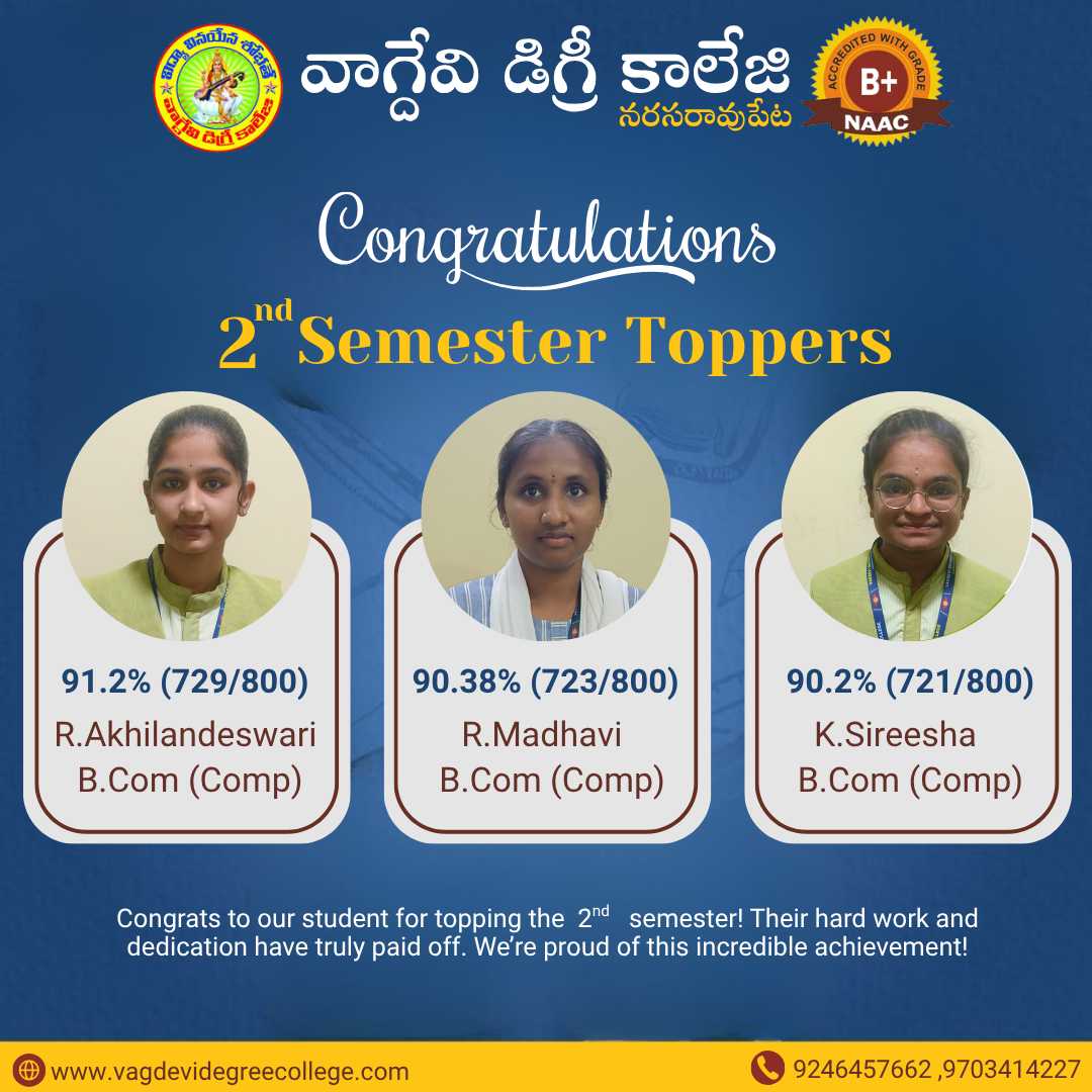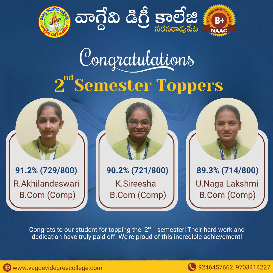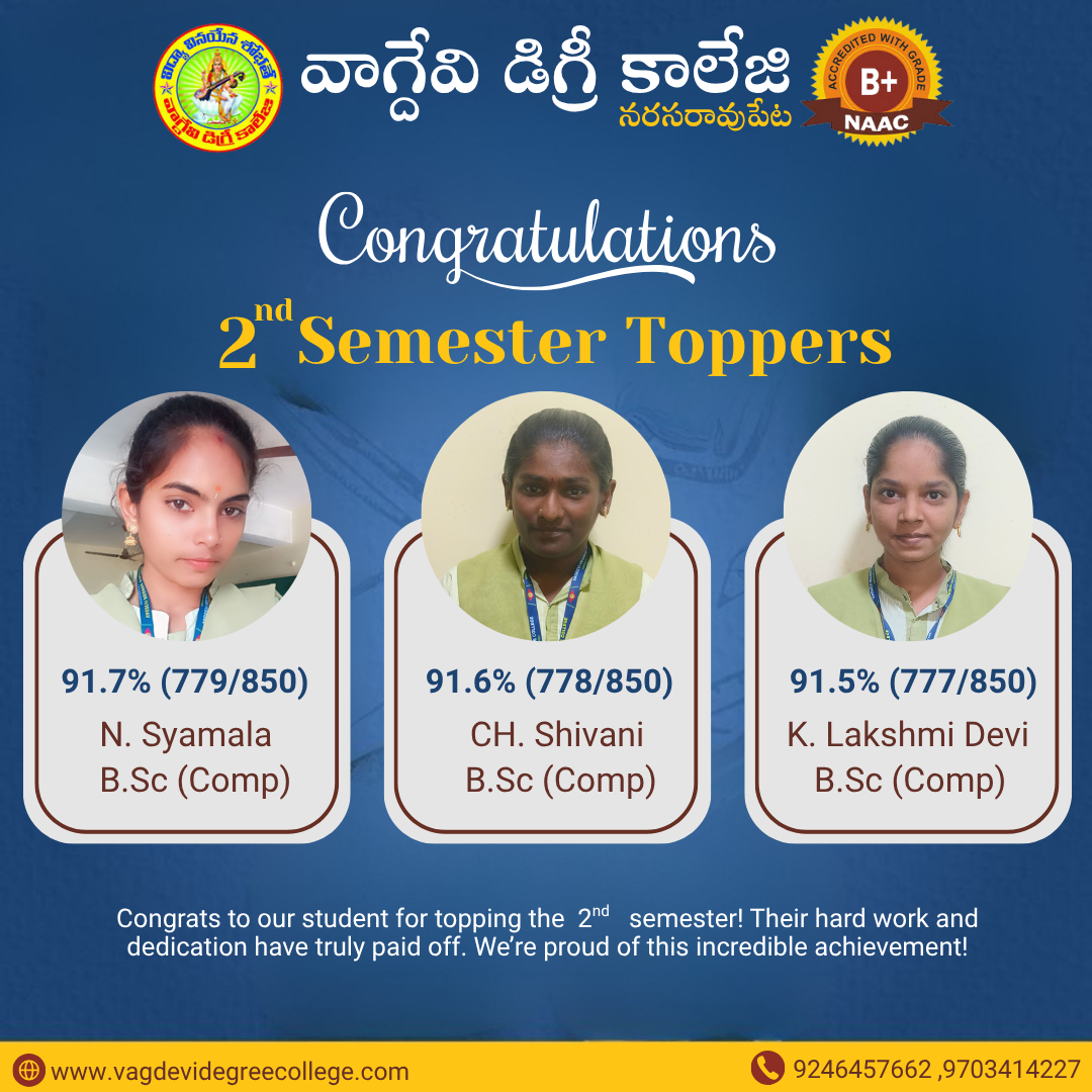 UG 2ND SEMESTER REVALUATION RESULT AUGUST-2023 | ANU UG SEM 5 SUPPLY EXAMINATION RESULTS FOR NOVEMBER-2023 | ANU UG DEGREE ONE TIME OPPORTUNITY EXAMINATION SEPTEMBER/OCTOBER RESULTS 2023 | ANU UG 2ND SEM REGULAR & SUPPLEMENTARY EXAM RESULTS JUL/AUG 2023 Notice Board UG 4th sem revaluation results 2 Sem Results Released April 2025 Principal's Message Vagdevi Degree College , Narasaropet was established in 2013 in Palandu region with aim of provide a quality education for rural areas of this region and urban students. It is one of the reputed Degree colleges in Narasaropet. Read More About College Spotlight Focus Departments Administration Academics Recognitions Vacancies Azadi Ka Amrut Mahotsav College Magazine Committees Placement Cell Sports Facilities Results Notices Committees Alumni Press Releases Photo Gallery B.C.A 4TH semester Toppers in Narasaraopet BSc 4TH semester Toppers in Narasaraopet B.Com 4TH semester Toppers in Narasaraopet campus placments campus placments campus placments B.com 5th Semester Toppers BSC 5th semester topers BSC 5th semester Toppers BSC 3rd Semester Toppers B.Com 3rd Semester Toppers BCA 3rd Semester Toppers View All Photo Gallery Video Gallery View All Video Gallery